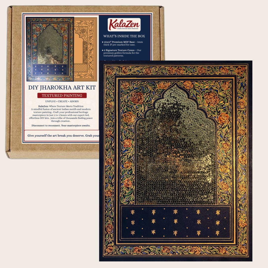 Take the iconic Jharokha arch to the next level with a rich blue base and vibrant multicoloured accents. Inspired by traditional Indian art and reimagined in a contemporary colour palette, this DIY wall art kit produces a jewel-toned wall piece that commands attention. The gold cone texture and mirrors seal the look with a premium, handcrafted finish.